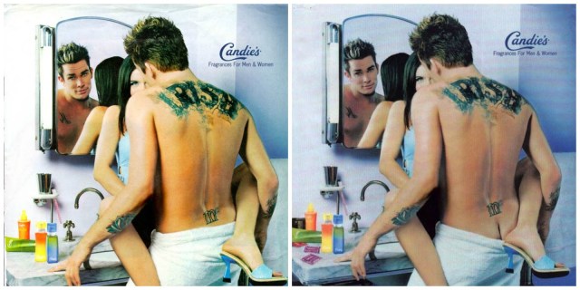 Relating to the Bloomingdale’s ad, I want to take a second to look back at an advertisement that has always stuck with me when I assign the visual analysis essay. The Candie’s advertisement (which is actually two) from 2000 highlights perfectly the idea of audience for students. Both ads show a man and woman embracing on a bathroom sink. Obviously, it appears that the two will engage in sex. Unlike the Bloomingdale’s ad, this one appears consensual. The consensual nature of the ad is not the topic that I discuss with students though. Instead, I point out that the image on the left appeared in magazines like Seventeen, and the one on the right appeared in Cosmopolitan.