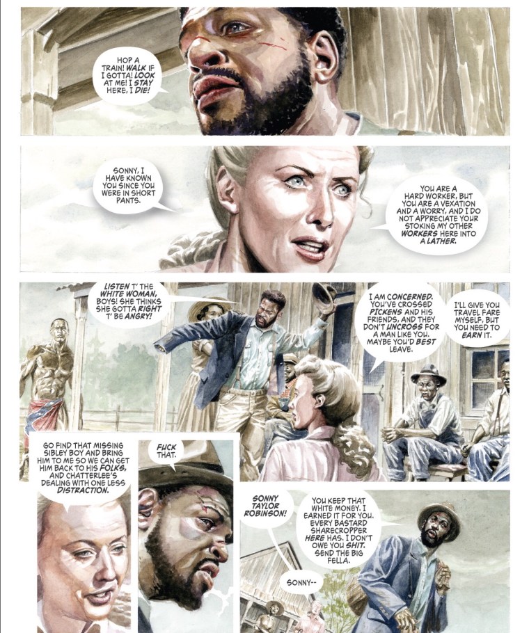 The next panel shows Sonny in the foyer and Blankenship and Lantry’s backs through the open doors. Lantry tells Pickens and his men, “My boys do a fair day’s work for a fair day’s pay. I need all the hands I can get, and I’m not about to lose my home to a buncha men too old t’be playin’ cowboys and Indians.” Here, Lantry echoes Blankenship. Her plantation cannot survive without Black labor. While Waid and Jones present this aspect of a racist society founded on the backs of Blacks, Native Americans, and others, the moment passes and no interrogation occurs. This causes the text to falter because readers, inculcated by countless other examples, view Pickens and his men as the obvious threat and see Blankenship and Lantry as benevolent whites trying to protect Sonny. However, they are not necessarily trying to protect Sonny because they like him; they seek to protect him because he, and others, benefit them financially.