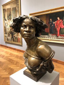 The first piece I encountered was Jean-Baptiste Carpeaux’s sculpture Le Négresse (1868). The woman, bound with rope, looks defiantly off to the side. She has an expression of determination and resilience, and I read the sculpture, even upon seeing it with no contextual information, as a piece that highlights the horrors of slavery. The bust is part of the project Carpeaux undertook for the Fontaine de l’Observatoire which displays four female figures, each representing different continents, holding up the globe. Le Négresse represents Africa, and at the base of the bust Carpeaux added the words, “Pourquoi! Naître esclave!” (Why be born a slave?)
