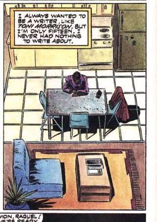 Freeman tells Raquel to meet him in three weeks, and on his way to bridge to meet her, he thinks about Raquel’s words that he should be an example. He walks through Paris Island, the inner city of Dakota, and ponders Raquel’s statements. The panels show him walking through an inner-city environment with run-down buildings, garbage in the street, and children playing in puddles. He questions his thoughts that the individuals who live on Paris Island and “who suffer under such conditions must have brought them upon themselves.” He concludes that he has lied to himself. As such, he thinks that he “must provide an example” to counter the hopelessness that the people feel.