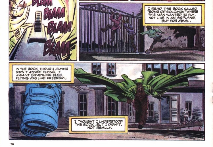 As a successful lawyer, Freeman thinks he should be able to land in the crowd and ask the policemen if they need a hand. He does not consider the way they may react to a Black man, flying in from the sky, landing in their midst. He does not see the racist underpinnings that cause them to view him as a threat. Rocket points this out to him when she asks, “You think the cops are sitting around waiting for a flying nigger to drop out of the sky and do their job for them?”