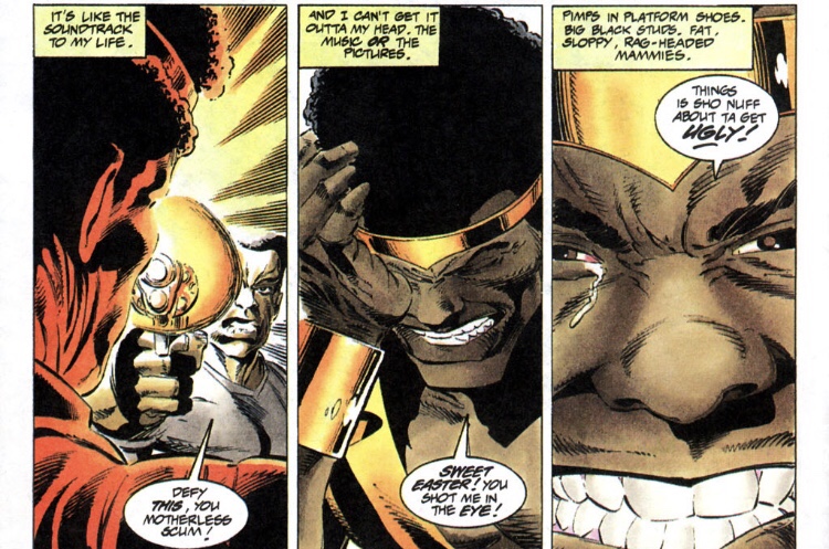 As Buck Wild battles the men shooting at him, one aims a gun at his face and pulls the trigger. The bullet stuns him, and the next panel shows a close up of Buck Wild holding a hand to his eye. Still pondering the “played-out record,” Buck Wild thinks, “And I can’t get it outta my head. The music or the picture.” The next panel shows a close up on Buck Wild’s face, and in his right eye, the one that took the bullet, there appears to be a tear running down his cheek. Teeth clenched, eyes ablaze, he continues to think, this time about the pictures: “Pimps in platform shoes. Big black studs. Fat, sloppy, rag-headed mammies.”