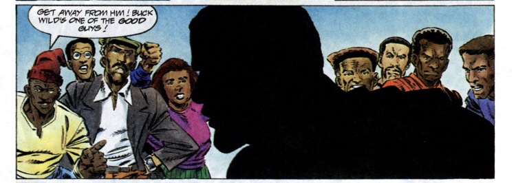 Buck Wild continues to fight, and as he does, thoughts continue to enter his mind. The record may be played out, he thinks, “but nothin’ new ever came to take its place. So I keeps that song runnin’ through my head.” Since the 1970s, what Black characters from the major two publishers deviated from the blaxploitation model? Black Panther may be the only one, but he went in a different direction in the late 1970s when Jack Kirby took over the series. Between the 1970s and the early 1990s, the image stayed the same, playing up urban environments and treating readers to tours of the ghetto laced with stereotypes and inaccurate representation.
