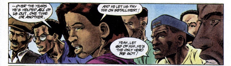 As the issue progresses, Rocket and Icon encounter Buck Wild, who is under the control of Lysistrata Jones. During the fight, members from the community gather and begin to throw cans and yell at Icon. They tell him to get away from Buck Wild because he’s “one of the good guys.” One panel shows the crowd telling Icon that Buck Wild lets them pay in installments and that “he’s the only hero we got!” Here, again, we see the “played-out record” that Buck Wild references early on in the issue. If Buck Wild is the only representation, what does that do? What does that say? What mentality does that create? These are questions that Icon #13 works with.