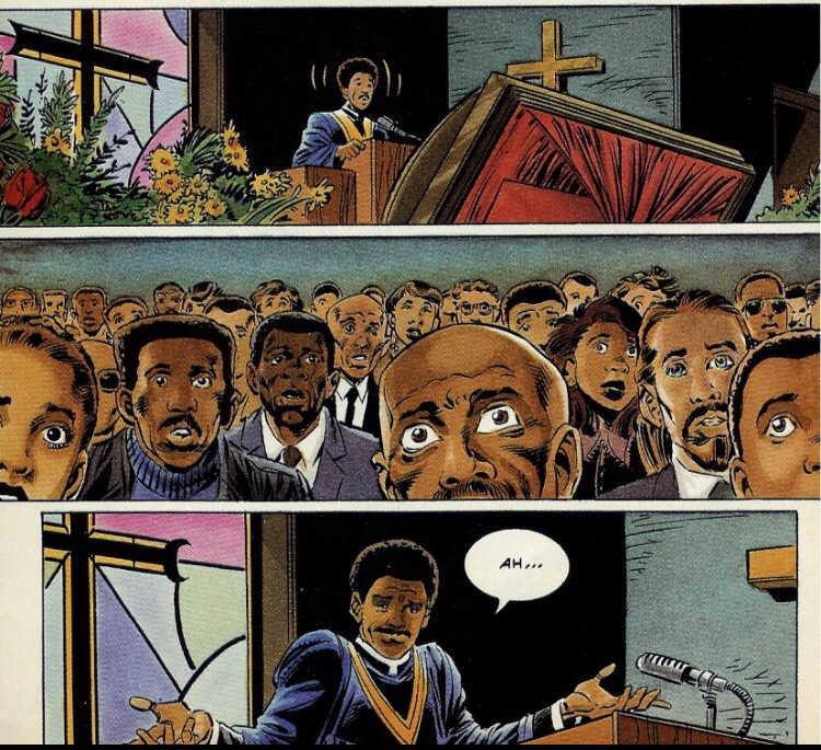 Perhaps the most telling image comes at the end as Icon wraps up and tells the congregation, “Were it not for him we would not be here today.” This panel, like the one at the end of the reverend’s eulogy, shows Buck Wild’s casket. However, the perspective is different. With the reverend, we gaze at the pulpit from an angle, and all we can see of the casket is the lid. We do not visually know who lies within. In the latter panel, we view the scene head-on, Icon standing at the pulpit and Buck Wild’s casket below him. Here, we see Buck Wild in the casket. The image, in conjunction with Icon’s words, is important. It highlights the connections between Buck Wild (Luke Cage) and Icon. It shows what came before. It shows history. It speaks, as eulogies do, for the present and the living. It points towards the future.