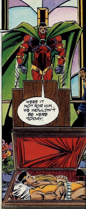 Over the past few posts, I have explored Buck Wild in Dwayne McDuffie and MD Bright’s Icon. Today, I want to conclude that discussion by looking at Icon #30, the one with Buck Wild’s funeral. In many ways, Icon #30 sums up the discussions on the history of representation of Black superheroes that Buck Wild critiques. The entire issue takes place at Buck Wild’s funeral, and the eulogies all satirically comment on the history that Luke Cage, Black Lightning, Falcon, and Brother Voodoo embody, a history that while working to forward a more representative comics’ universe falls prey to cultural stereotypes that limited the overall impact of these characters and created tensions within fans about whether or not to accept or disregard these attempts.