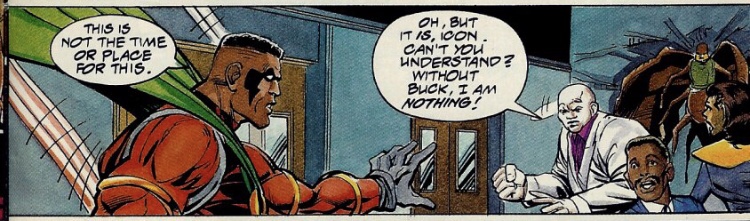 Taking on the mantle of Icon, it seems that Buck Wild has the opportunity to grow and change. He does, to a certain extent. He looks up to Icon, and he strives hard to match Icon’s image. Even with this change, though, he does not survive. Oblivion knocks him unconscious and he eventually passes away in Icon #29. As Rebecca Wanzo puts it, “[Buck Wild] stands for ‘physically stuck’ representations. McDuffie suggests that rather than try to revamp the old stereotype, it is time to develop new paradigms.” This is exactly what occurs in Icon #30 with Buck Wild’s funeral. His existence ends, paving the way for Icon and Rocket.