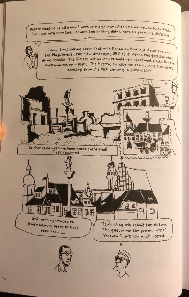 I relate my experiences because Jérémie and Martin essentially did the same thing. We Won’t See Auschwitz begins with Jérémie on his own in Warsaw. Walking the streets, he searches for his grandmother’s house. As he wanders, he thinks about the reconstruction of the Old Town. Jérémie talks about the reconstruction of the Old Town in 1949 and the fact that UNESCO has classified it as a World Heritage Site. The whole area makes Jérémie feel conflicted: “I have to admit I find this exceptional historical initiative discomfiting.” He sees the resilience of the people in rebuilding, but something does not seem right.