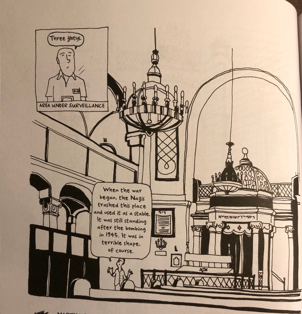Jan takes the brothers around town, showing them the “Ulica Prozna, the last actual trace of former Jewish life,” sadly in disrepair, and a renovation project that the Jewish Renaissance Foundation started. The project would be a recreation of a Jewish street, “but,” as Jan tells them, “it cost too much. It’s quite possible these buildings will end up demolished when the facades start crumbling.” Jan finishes by taking them to Noźyk Synagogue and tells them that Nazis used it as a stable during the war and after the war “the city council and the community fought over ownership.” Eventually, the court ruled that the synagogue belongs to the community.