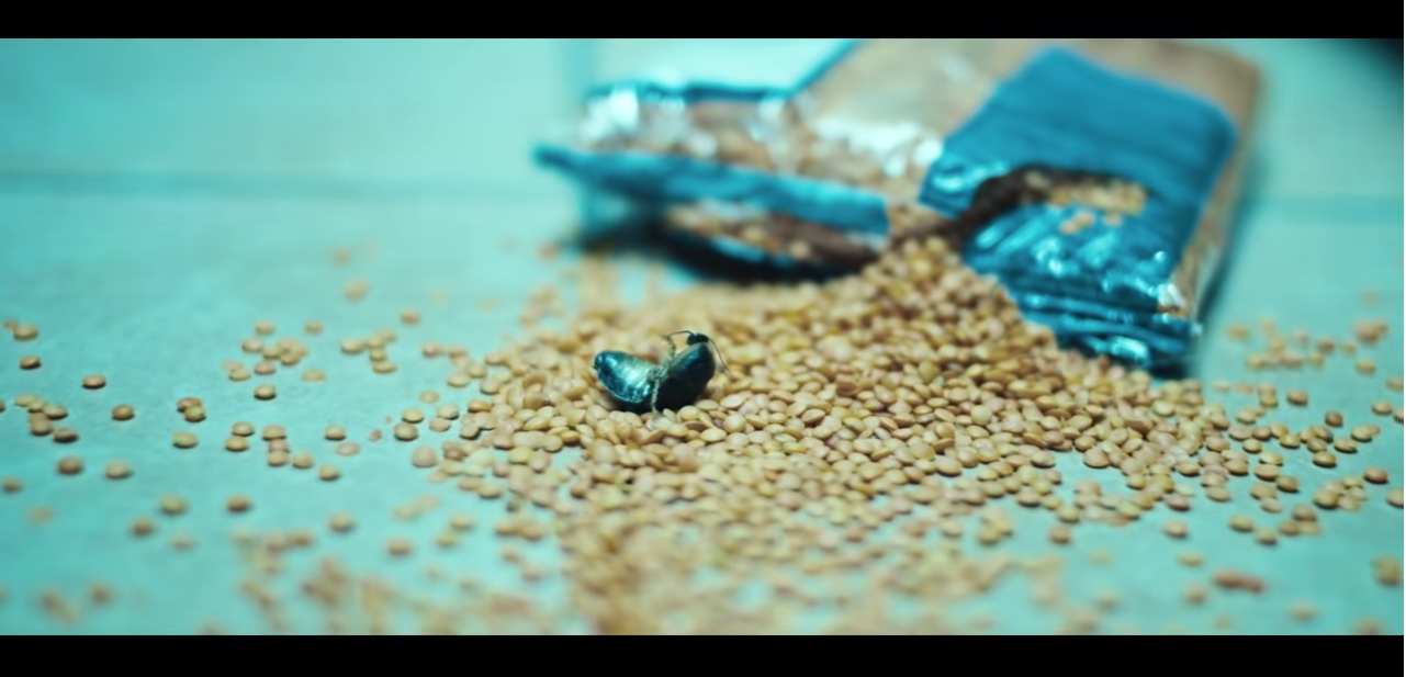 After Magdi’s line “Ankerbarna dine kom, så mokkamenn kan vinne i lotteri?” (“Anchor babies can come, so mocha men can win the lottery?”) we get the responding question about the speaker’s tax deduction. At this moment in the video, a bag of lentils falls off the shelf and bursts open on the floor to reveal a cockroach on its back struggling to right itself. Bugs appear throughout the video, in various ways, symbolising the idea that immigrant and asylum seekers are an infestation, a threat to society. Taken with the lyrics throughout the song, these images link the store clerk and others in the video to animals, to bugs, to invasion.