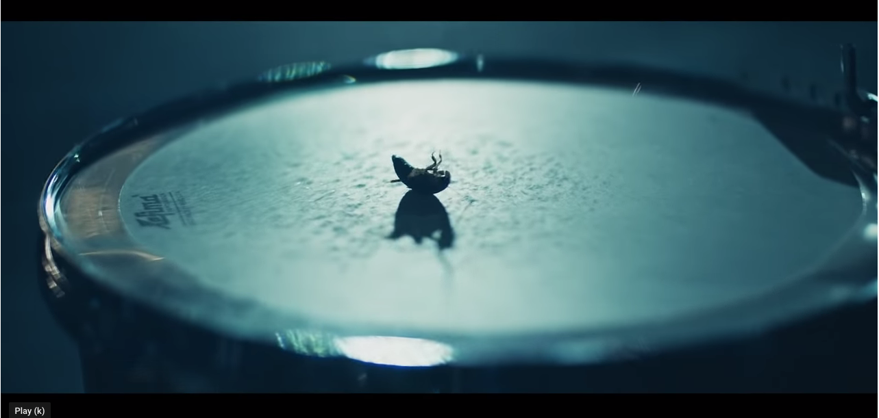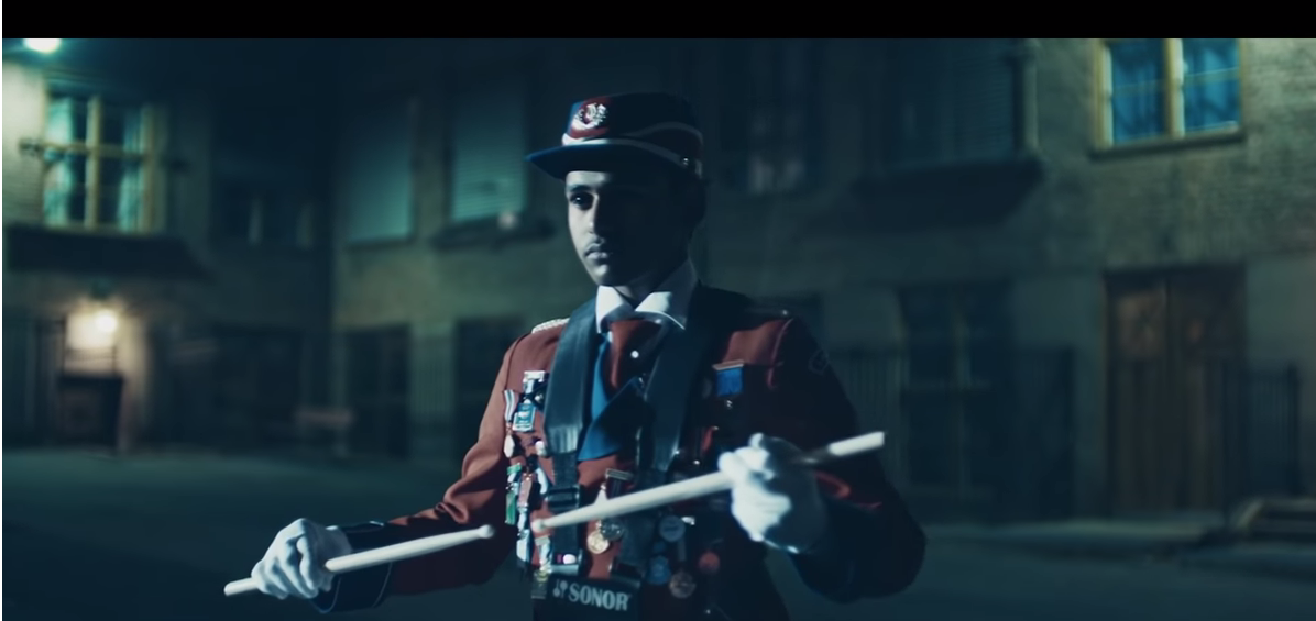 The speaker seeks equality, safety, understanding, but the person in the basement apartment denies any of this. As such, Chriag labels that person «en feiging» (“a coward”) for denying access to equality and for hiding in the basement when making and thinking racist and xenophobic comments. In the video, the first refrain ends with a shot of a boy in a drum corp uniform,. In Bergen, there are neighbourhood “Buekorps” that practice throughout the year and march on May 17, Constitution Day. I am not sure about the tradition in Oslo. The uniform appears to be from Bjørndal, an area east of Holmlia. The boy appears to have assimilated into Norwegian culture, even taking on a role in the school drum corp; however, the ending shot zooms in on the head of the drum, showing another cockroach, on its back struggling to right itself.