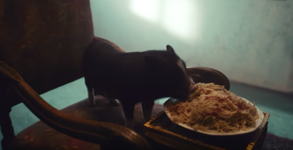 Another image during Magdi’s verse shows a pig devouring a plate full of spaghetti. As I’ve mentioned before, pig imagery plays prominently throughout the Heisann Montebello videos, and here it highlights excess and surplus. The pig is small, and the plate is piled high with food. The pig could devour the food, but does it need all of the food on the plate? Could some of that food go to others?