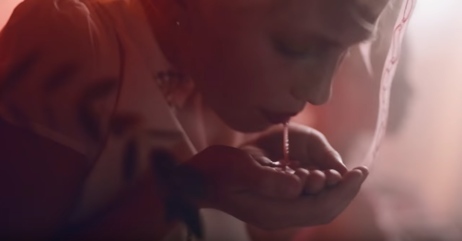 The video for «Hvite menn som pusher 50» has a lot of interesting aspects, and I do not have nearly enough space to look at them in detail. Instead, I want to point out a few things. For one, as I mention earlier, Chirag appears amongst the social elite during his verse, and within that setting there are children, specifically a little girl, who spits things up throughout the video. In Magdi’s verse, she throws up what appear to be pearls, a symbolic image of how she has ingested this lifestyle. She grasps them in her hand then throws them against the wall, and they become liquid, looking like blood.