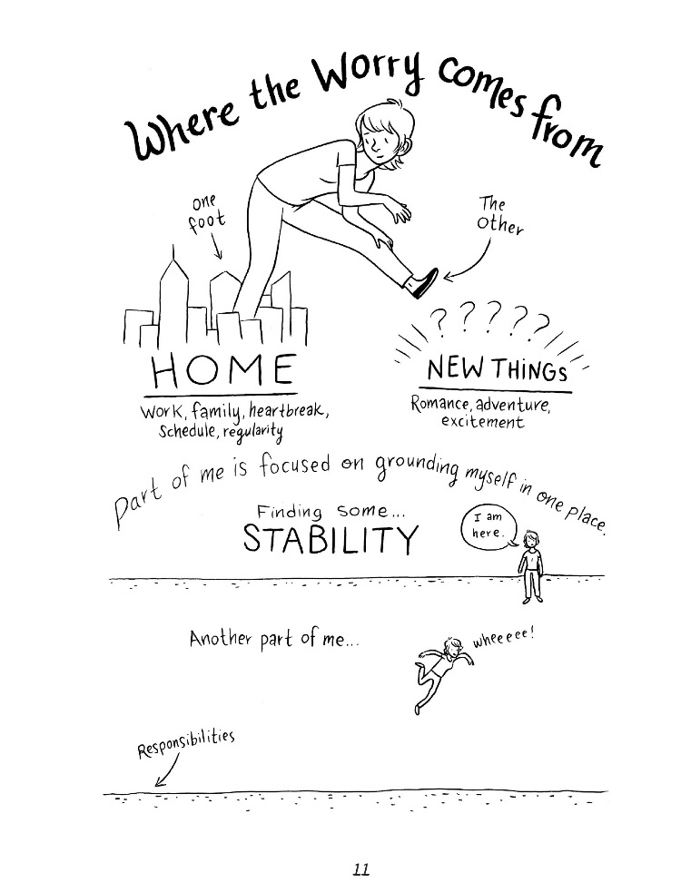 The next image follows the same pattern, having the reader move from the left to the right of the page. Here, the top reads, “Part of me is focused on grounding myself in one place. Finding some . . . STABILITY.” Knisley stands on terra firma, on the left side of the image and says, “I am here.” In this section, her desire for stability and grounding shows up in the fact that she has distinctly illustrated the ground, placing herself firmly upon it and staking the claim that this is where she currently resides. The bottom image, though, displays the other side that she feels, the side that wants adventure and travel into the unknown. Here, she flies through the air, away from “responsibilities” as she lets out a jovial “Wheeeee!”
