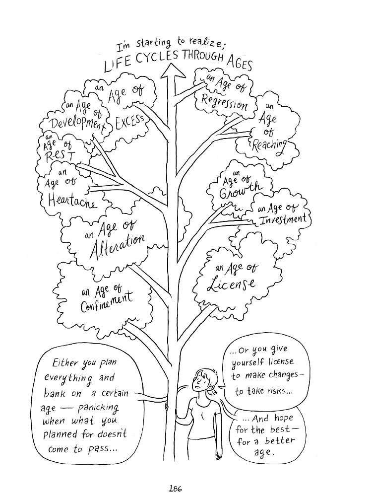 At the end of An Age of License, Knisley has a full page displaying a tree with an arrow pointing to the sky that represents “life cycles through the ages.” These include things such as” an age of license,” “an age of alteration,” “an age of heartache,” and more. Knisley stands next to the trunk of tree and says, “Either you plan everything and bank on a certain age–panicking when what you planned doesn’t come to pass . . . or you give yourself license to make changes–to take risks. . . and hope for the best–for a better age.” Here, Knisley sums up what I’ve been writing about. Life happens. We need to be open to experiences, to these different ages. We need to be open to having multiple homes that allow us to grow and interact with others.