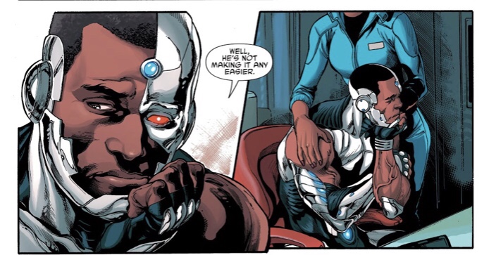 Writing about Walker’s Cyborg, Christian Hoffer notes, “One of the core elements that jumps out in Cyborg is how quickly Walker establishes the character as a human being.” After dying and regenerating, Victor heads back to STAR labs so his father Silas and Thomas Marrow can run tests on him to see how he managed to come back to life. This sequence occurs in the first issue, and the whole time that Victor plays back what happened, Silas and Thomas stare in amazement, speaking with each other and occasionally asking Victor a question. They focus on Victor’s regeneration and the causes, not on Victor.