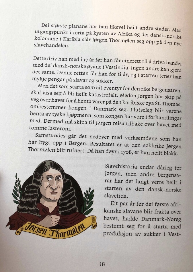 For me, I have become intrigued by the historical amnesia that perpetuates Norwegian exceptionalism and egalitarianism while ignoring the racism that underpinned the nation’s noncolonial colonial past. At the local library, I came across a few books, basically graphic novels and children’s books, that seek to correct this memory loss. During one of my first visits to the library, I found Slaveskipet Fredensborg Den siste reisen 1767-68 by Kurt Aust, Leif Svaesen, and Kin Wessel. The graphic novel tells the story of Erich Ancker, a 14 year-old Norwegian who set sail and worked upon the slaveship Fredensborg during its trip from Copenhagen to Africa and back. It wrecked off the coast near Arendal in December 1768.