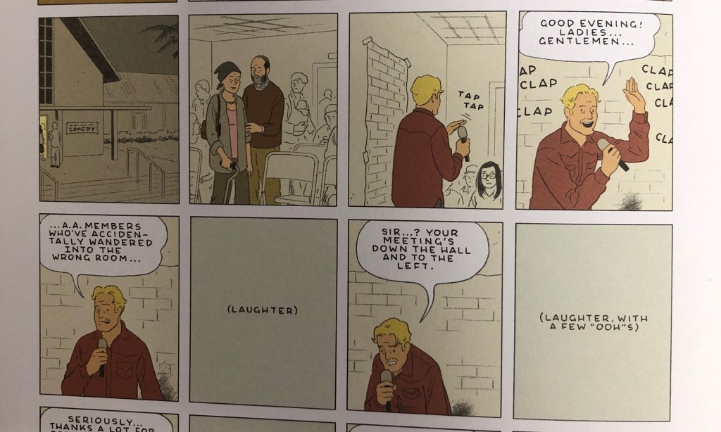 The father and daughter go through daily activities, and Tomine shows how the mother’s death has affected the father. The story ends with the daughter performing at a comedy club, and she tells the father that she doesn’t need help rehearsing and that the event is private. He sneaks into the club and sees her bomb her routine, the crowd (us)boos her and tells her to get off the stage.
