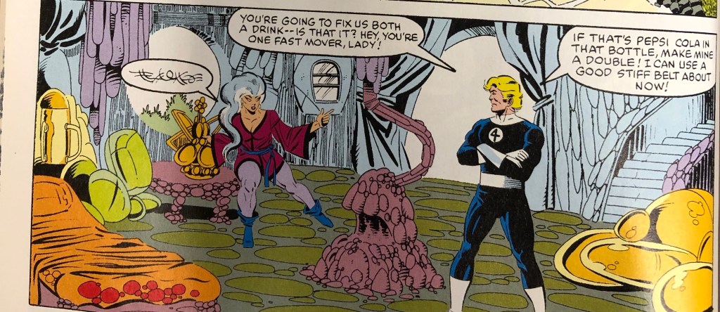 In fact, Zsaji never speaks in English to anyone throughout the series. This move inhibits her agency and our ability, as readers, to determine how she truly feels. Instead, Johnny and Colossus always project their feelings onto her. When Galctus summons his planet into the Battleworld’s orbit, Zsaji takes Johnny into her dwelling. Johnny thinks that she is doing this to spend time with him, and when they enter, he thinks she is fixing him drinks. Johnny’s thoughts only present Zsaji as love interest, not as someone who can assist him and the others in their ongoing battles.