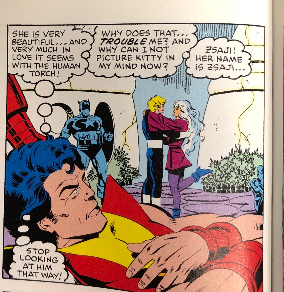 Later, when Colossus gets injured, Zsaji heals him, and he has the same initial feelings as Johnny. As he looks upon Johnny and Zsaji, he thinks, “She is very beautiful. . . and very much in love with the Human Torch! Why does that trouble me? And why can I not picture Kitty [Pride] in my mind now? Zsaji! Her name is Zsaji . . . stop looking at him that way!” Colossus’ thoughts introduce the triangle into the narrative, and his initial thoughts also present Zsaji as a possession, not as an individual.