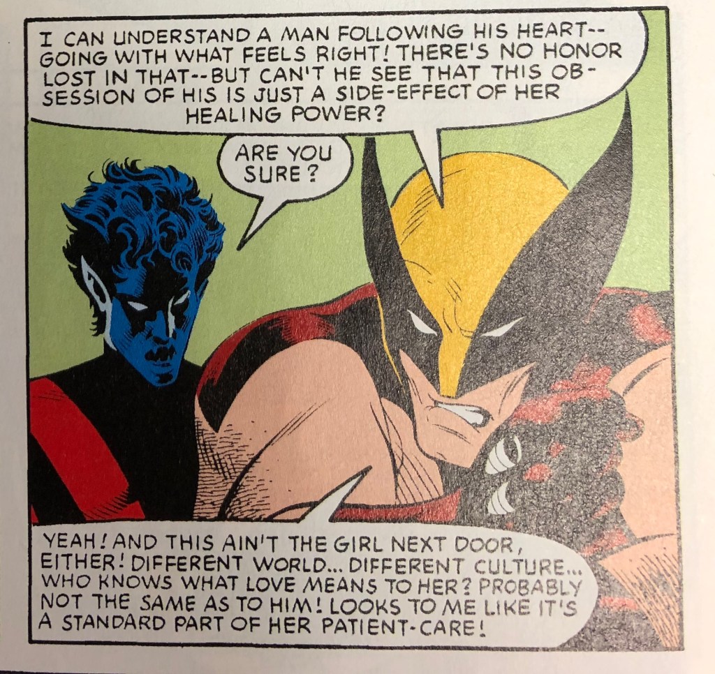 Along with the adolescent male fantasies, Zsaji also represents fears over relationships between people of different races and ethnic backgrounds. Immediately after the scene where Colossus expresses his love, we see Nightcrawler and Wolverine talking about where Colossus has run off to. Wolverine tells Nightcrawler that Colossus’ obsession stems from Zsaji’s healing power, and he continues by stating, “This ain’t the girl next door, either! Different world . . . different culture . . . who knows what love means to her? Probably not the same as to him! Looks to me like it’s a standard part of her patient-care!”