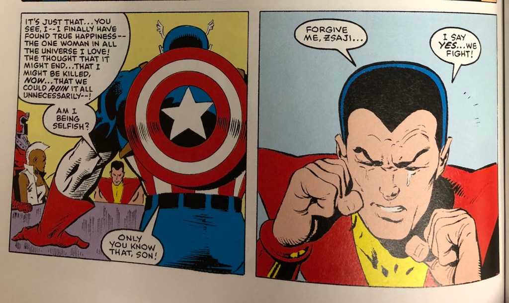 Meeting with the rest of the heroes, Colossus must decide whether or not they shall fight Doom. Captain America tells them that they will not attack Doom unless everyone agrees. Colossus is the last to agree, and he tells those gathered around the table that he has finally found the woman he loves and that if they attack Doom all that may go away. He asks them, “Am I being selfish?” The final panel of the penultimate issue shows a closeup of his face, fists clenched, and a tear rolling down his cheek as he says, “Forgive me, Zsaji. . . I say yes. . . we fight!” This moment links him with the heroes, of course, but it also, as Johnny’s statement does earlier, places Zsaji’s life below his and those sitting around the table. He does not respond flippantly like Johnny does, but his response does push Zsaji to the side.