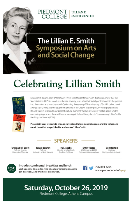 The symposium will feature presentations by Dr. Tanya Bennett, professor of English at University of North Georgia, Dr. Patricia Bell-Scott, professor emerita of women’s studies and human development and family science at the University of Georgia, Dr. Ben Railton, professor of English studies and coordinator of American studies at Fitchburg State University (Massachusetts), and Emily Pierce, a recent Lillian E. Smith Scholar at Piedmont College. The event will also include a screening and discussion of Hal and Henry Jacobs’ documentary Lillian Smith: Breaking the Silence.