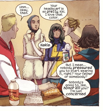 Zoe tells Nakia, “Your headscarf is so pretty, Kiki. I love that color.” In this panel, Nakia looks towards Zoe in disgust, with her hand underneath her chin. Zoe faces Nakia, smiling wildly as she makes the comment. Nakia responds to Zoe simply with her name, “Nakia.” To this, Zoe continues, “But I mean . . . nobody, pressured you to start wearing it, right? Your father or somebody? Nobody’s going to honor kill you? I’m just concerned.” Nakia corrects Zoe for calling her “Kiki,” and Zoe ignores her, choosing instead to show the stereotypes that she has imbibed by asking Nakia if her father made her wear the hijab.