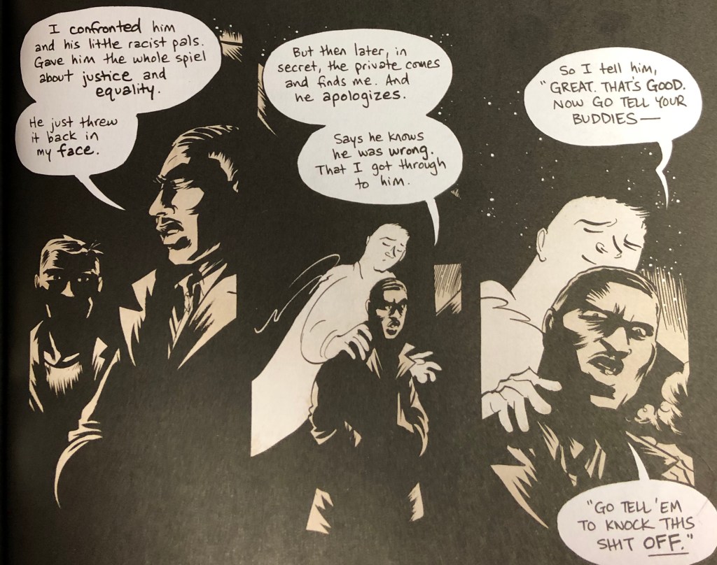 The next panel shows a closeup of Jacob’s face with the specter’s head leaning against the back of Jacob’s head and his hand on Jacob’s shoulder. Here, Jacob states, “So I tell him, ‘Great that good. Now go tell your buddies– Go tell ’em to knock this shit off.'” Again, the panel appears to be one of reconciliation, and we are left wondering whether or not the private actually confronted his buddies. Did he return to them and confront them for their racist words? Did he tell them that he was racist? Did he actually change? Jacob’s face, in juxtaposition with the ghost’s, tells us that he did not do any of these things.