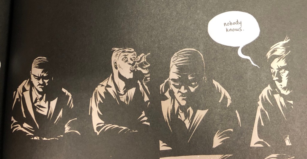 Jacob and Gideon stand outside Gideon’s house, talking about their experiences during the war as smoke curls from their mouths. Gideon recalls his time Germany he shot and killed another American servicemen, thinking he was a German. When he is finished telling the story, two panels show Jacob’s and Gideon’s faces with a dark background. In the first, Gideon takes a drink from a bottle and Jacob looks forward, stoically. In the next panel, Gideon says, “Nobody knows,” and Jacob cuts his eyes towards the right of the panel. With this, the two create a bond that brings them together, a bond based on their military service.