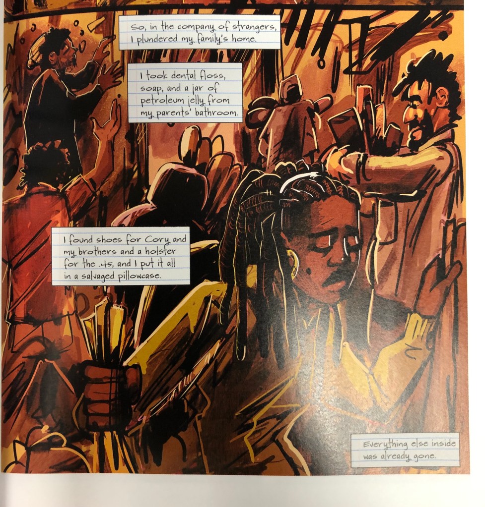 As I read John Ira Jennings and Damian Duffy’s adaptation of Octavia Butler’s Parable of the Sower, I kept coming back to Smith’s comments, here and elsewhere, about the empathy of children and the ways that as they grow that empathy may turn into a shell that walls them off from the rest of the world, isolated within themselves, unaware and uncaring about those around them.