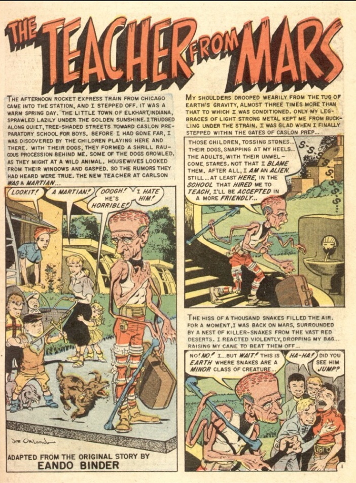 Eando Binder, when introducing the story for My Best Science Fiction Story, points out that “the idea of presenting a story in the first person, as told by a Martian, helped make it unique.” This positioning, when thinking about the ways that the story comments on racism and Jim Crow, causes the reader to identify with Professor Mun Zeerohs as he experiences discrimination. Binder, Feldstein, and Orlando’s adaptation plays on this positioning as well.