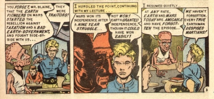 The two most important panels in this regard occur at the bottom of the third page. When Zeerohs states, “You forget, Mr. Blaine, that the Earth pioneers on Mars started the rebellion against taxation and a bad Earth-government, and fought side-by-side with us . . . ” Tom Blaine, pointing his finger at Zeerohs and cutting him off, yells, “They were traitors!” Here, Zeerohs is in the foreground on the left of the panel. Tom is in the background, pointing his finger at Zeerohs, and ultimately us as the reader. This positioning places the reader as the recipient of Tom’s statement.