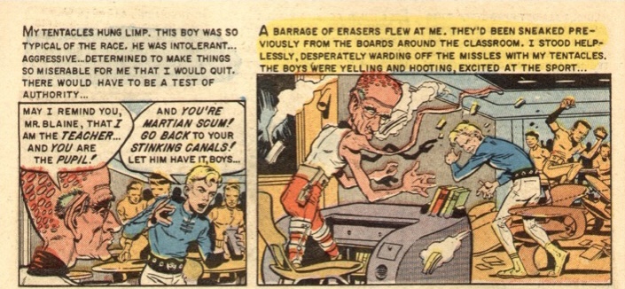 Last post, I wrote about the ways that Eando Binder’s “The Teacher from Mars” serves as a commentary on racism and Jim Crow during the mid-twentieth century. Today, I want to look at Otto Binder, Al Feldstein, and Joe Orlando’s adaptation of the story for EC Comics’ Weird Science-Fantasy #24 and at Feldstein and Orlando’s “Judgement Day!” Specifically, I want to focus on some specific panels from each story.