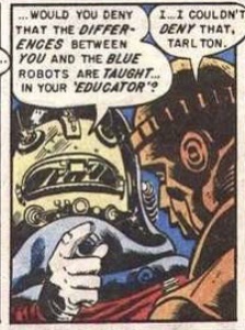 When the guide takes Tarlton to the blue factory and shows him the educator, Tarlton asks the guide, “Would you deny the differences between you and the blue robots are taught in your ‘educator’?” The guide hangs his head, stumbles, and replies, “I . . . I couldn’t deny that, Tarlton.” In the panel, Tarlton, in the background and looking at the guide, points his finger out of the panel. The guide is on the right side of the panel, in the foreground. Like the panel with Tom Blaine pointing his finger, Tarlton’s finger extends past the panel and points out towards the reader.