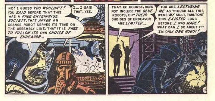 Two panels later, the position of Tarlton and the guide switches. Tarlton pushes for the guide to understand that the orange and the blue robots do not have the same opportunities. The orange robot, hand to his face in contemplation, tells Tarlton that once an orange robot has worked on the assembly line it can choose whatever path it wants to take.