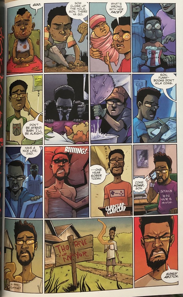 The last three panel son the page are subject to subject because we see Ezekiel in the present, back at home with his father in Freetown. We see a closeup of Ezekiel drinking coffee as he stares, shocked, at something out of the panel. The next panel, the larger one in the row, zooms out to show Ezekiel standing in front of the house with a sign that reads “Thorne for Mayor” in his yard, and the last panel moves back to Ezekiel’s face as he says, “Sonuvabitch.” Here, we move within the same scene from subject to subject, just as we did in the page from Bitch Planet.