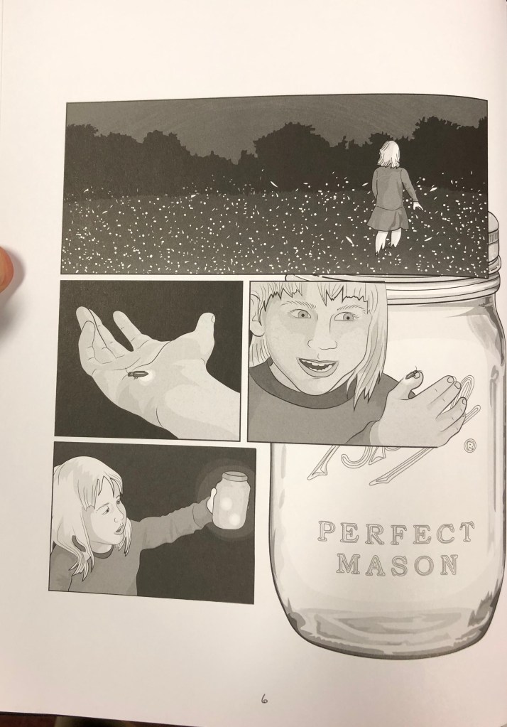 The next two pages shows Radtke and Dan going outside and catching fireflies. The panels are wordless except for one where Dan tells Radtke, “Look over there” while they peer through the bushes. The sequence begins by showing Dan, flashlight in hand, leading Radtke into the night. Both Dan and Radtke are in silhouette. Before we see the fireflies, we see Radtke’s open-mouthed and wide-eyed expression as she stares in amazement at the field. Then, we see the field covered in luminescent lights. The next panel shows Radtke walking amongst the fireflies in the field before we see panels where she grabs some and places them in a Mason jar.
