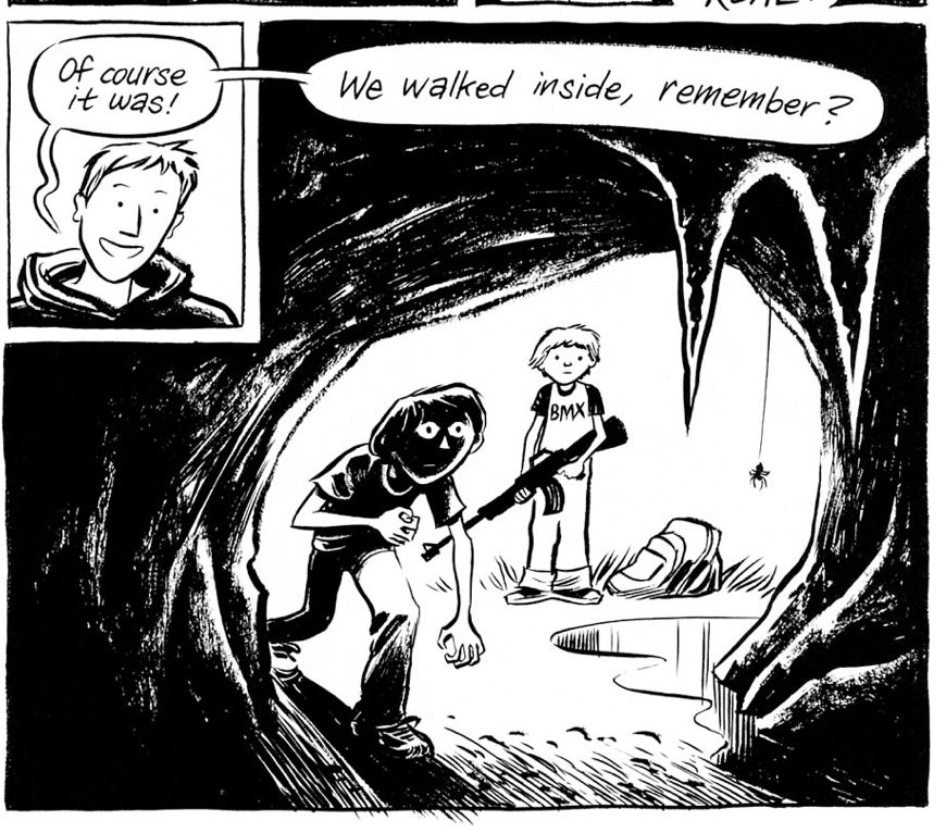 They talk about the reasons why the cave may have shrunk and disappeared, and Craig ruminates, “But that memory is so dream-like–too beautiful and cryptic to be true. I long since cataloged it as a creation of my subconscious.” In this panel, the background changes. We see the salamander, and we see Raina, and we see the surreal shapes that Craig uses throughout the text. In this moment, Craig questions not just the cave that he and Phil discovered but he also questions the reality of his relationship with Raina.