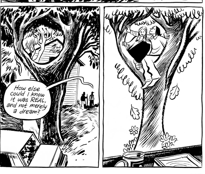In the next panel, Phil reassures his brother, “No. It actually existed. I was there.” This comforts Craig because someone else can authenticate his experience, and as they walk back home we see a tree, two large branches extending on either side, as Craig asks his brother, “How else could I know it was real, and not merely a dream?” This tree, along with Craig’s question, leads us to the adjoining panel of the picture that Craig painted in Raina’s room, a painting that depicts the two of them sitting in the same tree from the previous panel. It was real, and Raina can authenticate it, but the ways that she remembers it and the way that Craig remembers it are probably different. Thus, what is the “real”?