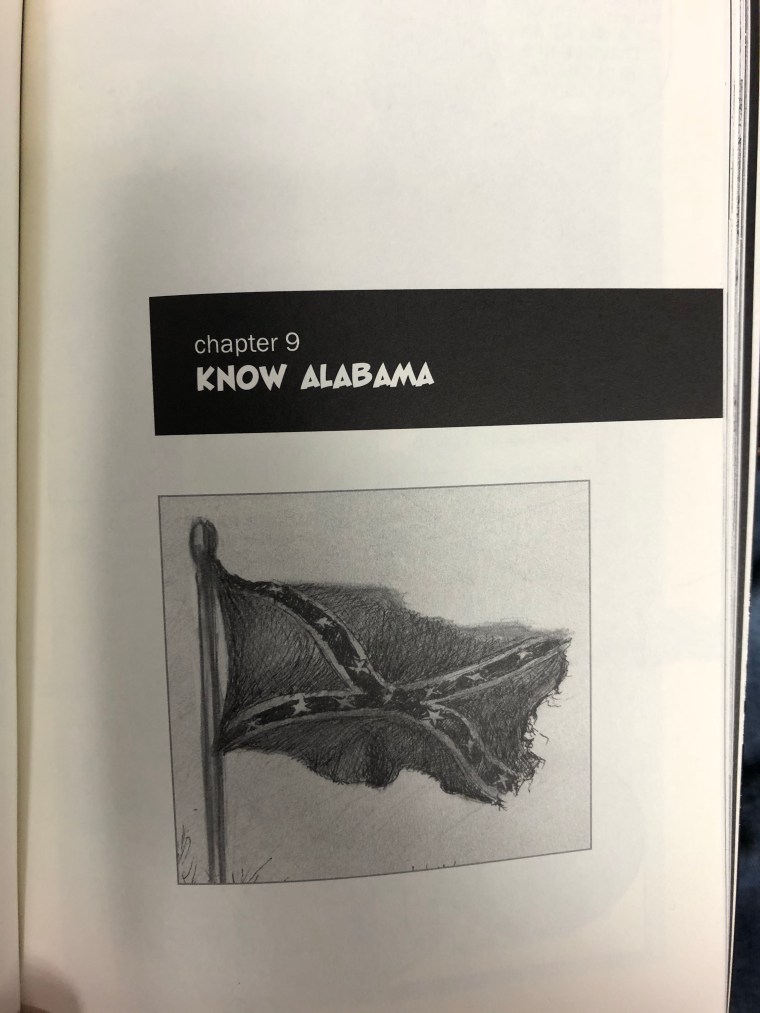 Weaver ends this chapter with one more image, a two-page spread of a blossoming tree with the narration, “The third attempt to march to Montgomery succeeded. By now, it was almost April, and the Civil Rights Act of 1965 was on its way to becoming law.” Ending the chapter with this image, Weaver highlights the hopeful nature of the moment, the hope of progress, the hope of a more equitable society. However, the next chapter, “Know Alabama,” undercuts that hope because it exposes the deep rooted racism embedded within the narcissistic belief in the superiority of whiteness. For this chapter, which is titled after Alabama’s 4th grade history book during the period, Weaver depicts a tattered Confederate battle flag, a fitting image for the idyllic narratives of plantation life and the heroic narratives of the Klan that Weaver depicts verbatim in the chapter.