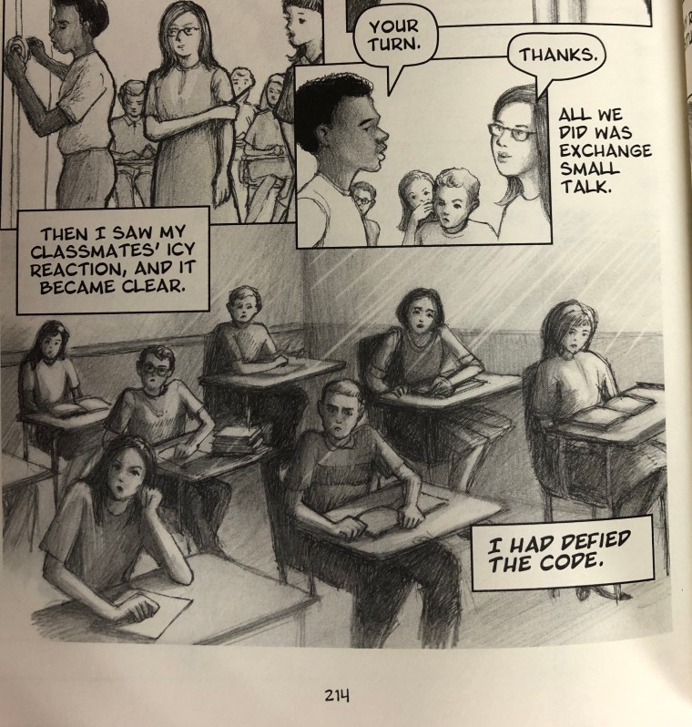 As a black male student sharpens his pencil, Weaver waits patiently behind him. When finished, he turns and tells her, “Your turn.” Weaver simply responds, “Thanks.” The panel shows the male student on the left looking at Weaver and Weaver on the right looking at her peer. In the background, we see the faces of white students. One boy looks mad, and a girl holds her hand over her mouth. Weaver narrates, “All we did was exchange small talk.” This moment marks Weaver because of her kindness, treating the male student as an equal, as a peer.