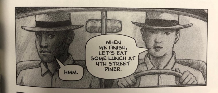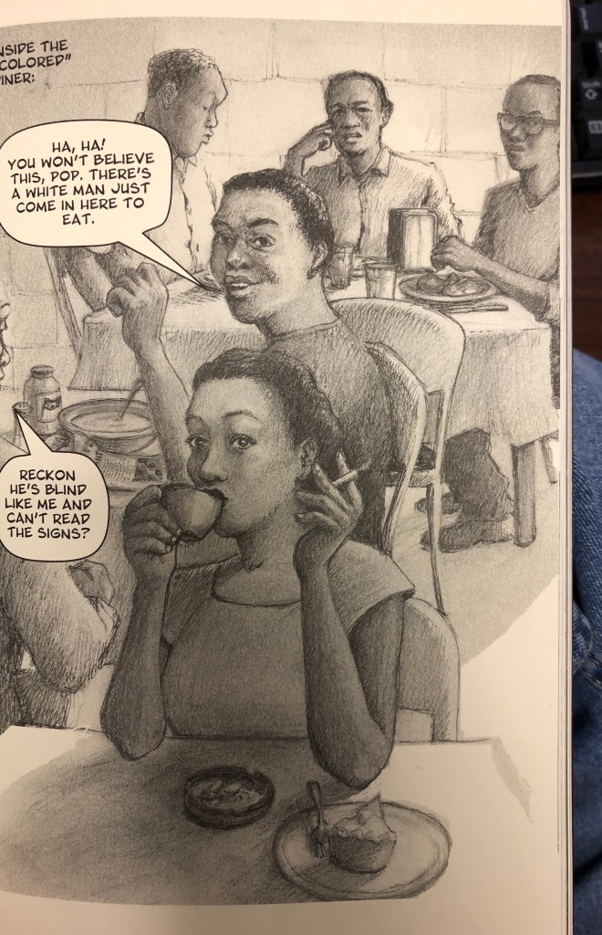 Weaver narrates, “By now, six years had passed since Daddy’s unhappy initiation to the South’s racial code. He was no longer naive. When he defied the rules, it would’ve been intentional.” The 4th Street Diner was segregated, and as they walk in, the man tells Quintero, “No, No! You’re supposed to eat up front in the white folks’ dining room!” Quintero responds, “Forget about that. We’re sharing a table.” Unlike in Texas, Quintero is white in Alabama, so eating with the man in the segregated room with other black patrons would be an act of defiance. As well, unlike the man in Texas, Quintero shares and fellowships with the man in Alabama.