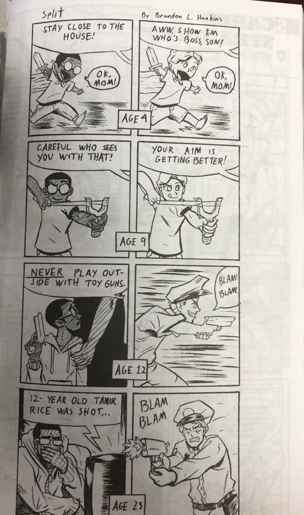 Brandon Hankins points this out in his piece “Spilt” which contains eight panels split in half. The left side of the page shows a Black boy through the years growing into a man and a white boy growing into a man on the right. When the Black boy goes outside at age 4, his mom tells him to stay close to the house. When he has a slingshot at age 9, she tells him to be be careful about who sees him with it. When he has a toy gun at age 12, she tells him, “Never play outside with toy guns.” At 23, he watches the news as the newscaster says, “12-year old Tamir Rice was shot.”