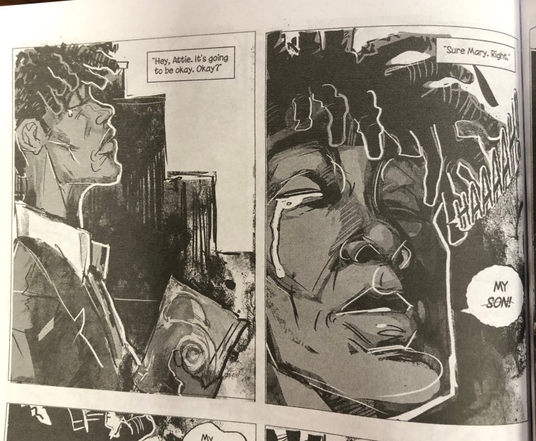 Visually, Atticus’ facial expressions run the gamut of emotions over the course of three panels. The first two, which depict Atticus crying, illuminate the pain that Atticus feels for his unborn child. The pain he feels because he knows how society will view him, as a beast, an animal with a target squarely on his back. The next panel, with Atticus’ hand over his mouth, culminates this thought as he laments for his son. He knows the ramifications. He knows the perceptions. He knows that his son will not be able to be a boy as white boys are.