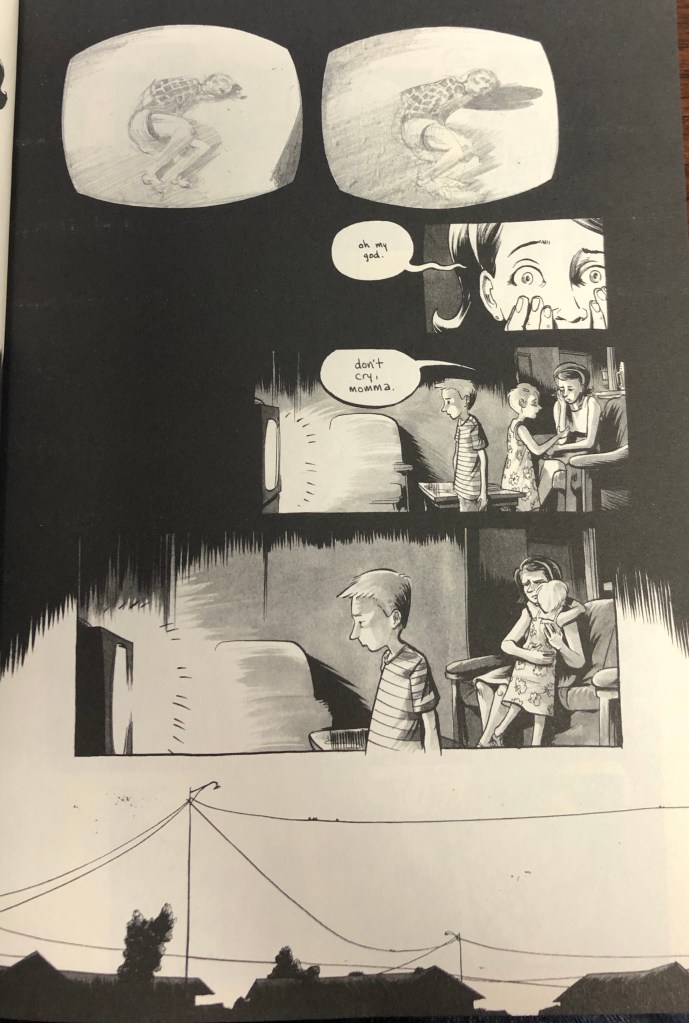 Powell depicts Patricia, with only her eyes, wide open, and nose in the panel. She holds her hands up to her face, and we see her fingers on either side of her nose. In this image, the shock of seeing Lém’s execution shows in her face as she says, “oh my god.” This panel is small, situated on the right side of the page, and the panels elongate towards the left as the page continues. The next panel reaches to the middle of the page and shows Michelle comforting her mother, telling her not to cry, as Mark stares at the television, no emotion really showing on his face. The next panel is centered and larger than the previous two. It shows Patricia hugging Michelle as Mark still stares at the screen. The final image is part of the background which moves from dark at the top of the page with the last images of Lém to light at the bottom and silhouettes of the houses and power lines on the street.