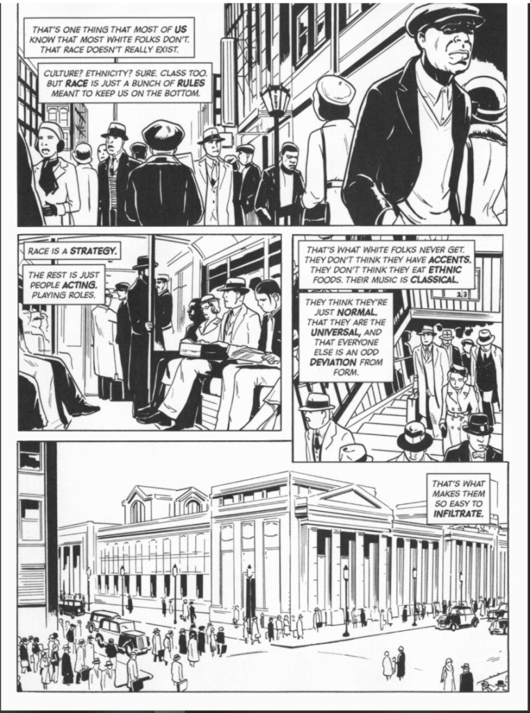 All of this leads me to the panels that lie underneath Zane’s narration. He talks about how easy it is for him to infiltrate white spaces due to white narcissism and our view that we are the center of the world. Working through the social constructions of race, we see Zane, in the first panel, walking along a street in Harlem, He is one of many African Americans strolling down the concrete. We see detail here. Each person has a level of detail that mirrors Zane’s. In the second panel, we see Zane on a subway car. An Orthodox Jewish man stands behind a pole in the middle of the panel, half obscured from our view. Zane sits with Blacks and whites on the right hand side of the panel. Less detail appears on passengers’ faces than the previous panel.