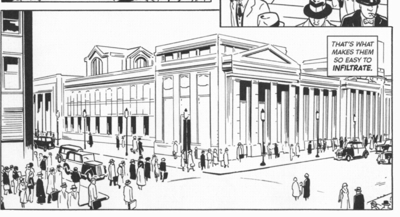 An outward view of Grand Central Station appears in the fourth panel, and we see countless people walking around on the street and into the station. Here, Zane states, “That’s what makes them so easy to infiltrate.” In this panel, individuals’ details are nonexistent. Instead, they appear as merely lines, devoid of expressions, faces, and more. The removal of these details serves two purposes. One, it proves Zane’s point of how easy it is for him to infiltrate white spaces. Along with this, it showcases Zane’s comment that whiteness views itself as the norm. No variety exists. No deviation exists.