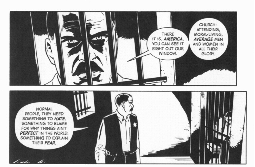 The next two panels appear near the end of the text. While the white townspeople of Tupelo lynch Carl in the town square, the sheriff looks through the bars of the jail cell and tells Alonzo, “There it is. America. Right out our window. Church-attending, moral-living, average men and women in all their glory.” The sheriff’s words drive home the enmeshing of Christianity and American nationalism, the ways that the two have become some entwined that uncoiling the mess will take deep, hard work.