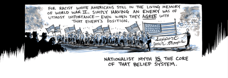 Powell concludes the page with a horizontal panel of a military parade depicting soldiers returning from battle. Two people at the head of the parade carry a banner that reads “Support your troops” as a throng walk behind them carrying American flags. Powell narrates, “For racist white Americans still in the living memory of World War II, simply having an enemy was of utmost importance–even when they agree with that enemy’s position. Nationalist myth is the core of that belief system.” In order to justify systems of racism, one must find an enemy that truly appears, at least in the eyes of many, as worst than themselves. As well, must must totally deny ever looking critically at oneself in the mirror because that action will inevitably illuminate the similarities between both sides in their oppression, subjugation, and murder of others.
